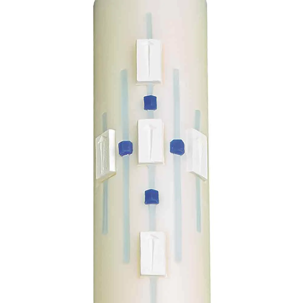 Ascension 51% Beeswax Paschal Candle Ascension heralds the risen Christ and features meticulous craftsmanship in an artistic pallet of soft celestial hues in sky blue and angelic white. The glorious centre cruciform presents the appearance of movement and rises upward from the flowing Alpha & Omega toward the ascending dove symbol of the Holy Spirit. During Easter Vigil services, the five incense pin tiles are placed in the cruciform, sealing the incense grains.